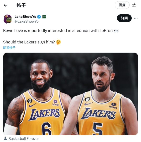 08月06日讯 湖人媒体LakeShowYo更新动态,晒出詹姆斯和乐福的湖人合成图,并写道:“凯文-乐福被报道称有兴趣和勒布朗(詹姆斯)重聚;“...