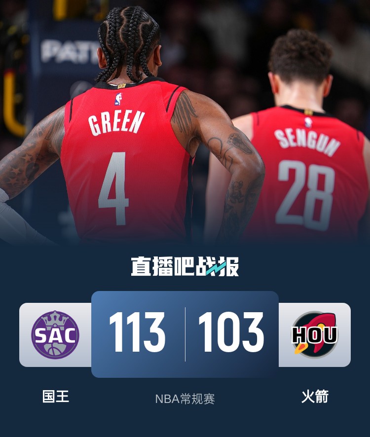 开场后不久萨博尼斯就受伤离场,国王依靠蒙克和德罗赞的发挥取得领先,他们多次利用挡拆打申京这点成功,随后火箭利用国王命中率下降的机会缩小分差。第二节上来依旧是国王率先发力,他们继续针对申京发起进攻,火箭及时调整咬住比分,申京在进攻端找到感觉联手狄龙一度帮助火箭反超比分,瓦兰丘纳斯毫不示弱也频频篮下砍分,半场过后国王依旧领先4分。易边再战,国王内外开花依旧打得有声有色,火箭则靠着杰伦-格林和申京的轮番发挥追分。末节决战火箭防守端始终无法限制住国王,虽然他们苦苦追分,但始终未能将分差追到两位数以内,最终国王113-103赛季三杀火箭。