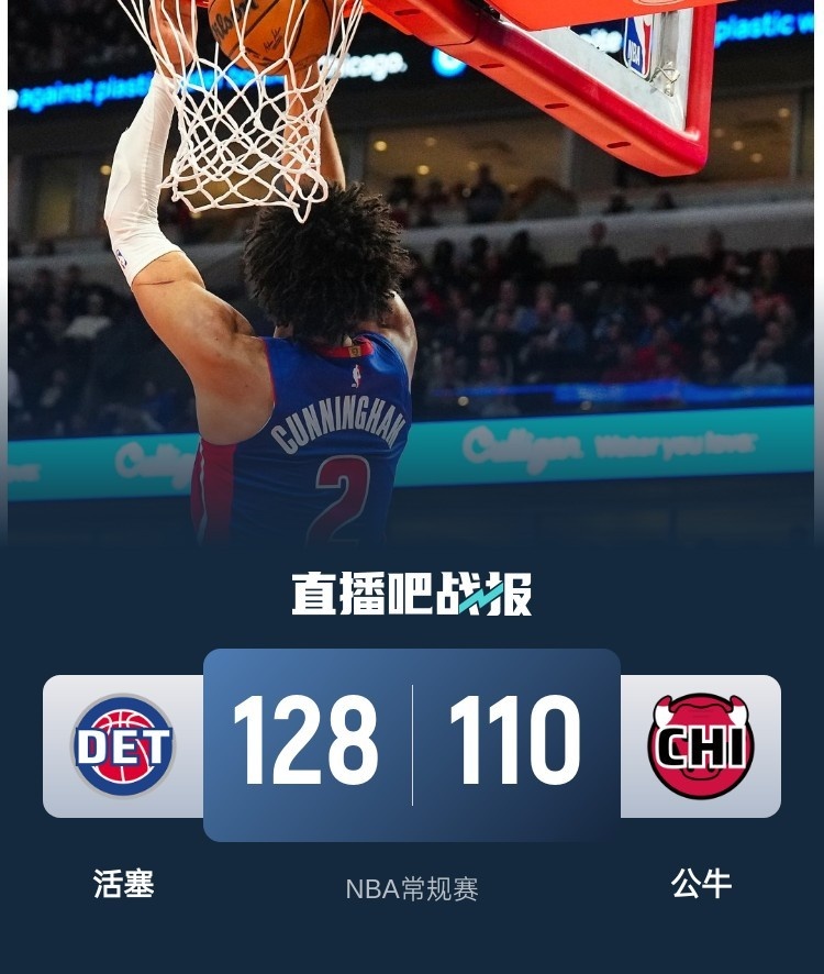 康宁汉姆29+7 奥萨尔19+7 武器22+13 活塞轻取公牛迎4连胜