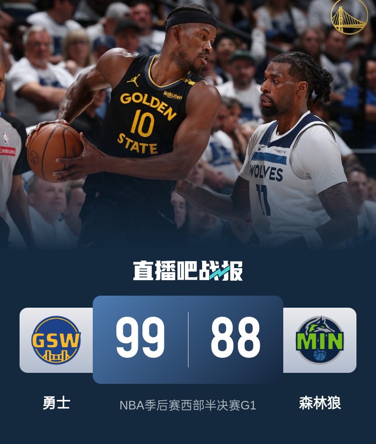 比赛上来,两队就打得十分胶着,场上比分交替领先,不过森林狼全队三分8中0,当家球星爱德华兹更是投篮6中0无得分入账,次节森林狼直接断电,前四分多钟的时间里一分未得,而追梦则是连中三分带领勇士轰出一波15-0的攻势,但库里和里德相继受伤回到更衣室,这一节森林狼只拿到11分,半场结束时勇士领先13分;下半场回来,希尔德连中三分将分差扩大到二十分,爱德华兹此后虽有复苏但勇士都给出了回应,末节里德个人连拿八分带队追分,而勇士的进攻遇到麻烦,分差被迫近到个位数,紧要关头希尔德和巴特勒相继得分稳住局势,最终勇士客场拿下森林狼取得系列赛开门红。
