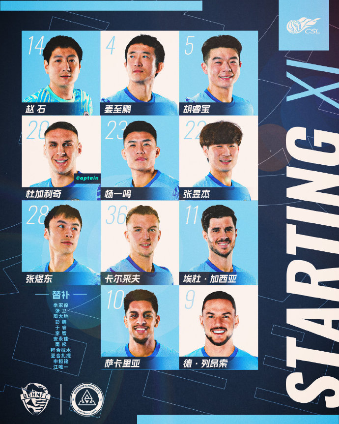 深圳新鹏城首发:14-赵石、4-姜至鹏、5-胡睿宝、20-杜加利奇(F)、22-张昱杰、23-杨一鸣、11-埃杜-加西亚(F)、28-张煜东、36-卡尔采夫(F)、9-蒂亚戈-列昂索(F)、10-萨卡里亚(F)