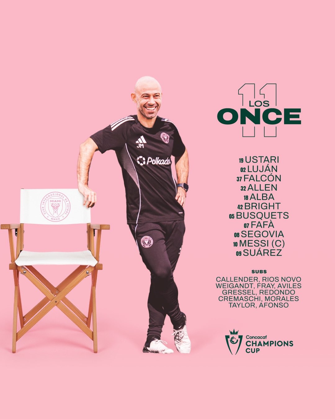 迈阿密国际首发:19-乌斯塔里、2-卢扬、37-法尔肯、32-阿伦、18-阿尔巴、42-布莱特、5-布斯克茨、7-皮考特、8-特拉斯科、10-梅西、9-苏亚雷斯