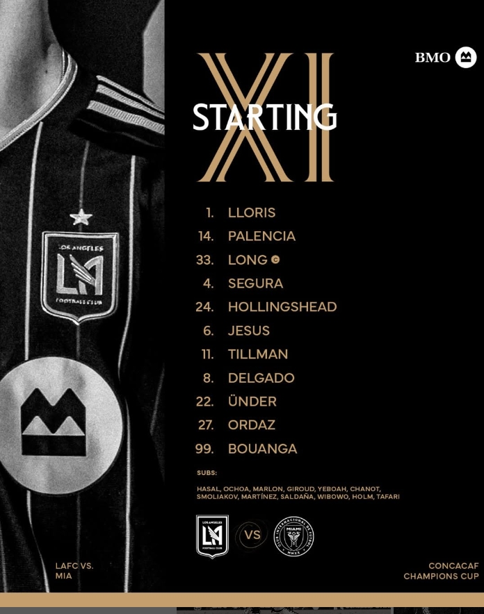 洛杉矶FC首发:1-洛里、33-阿隆-朗、24-霍林谢德、4-塞古拉、6-伊戈尔、8-德尔戈多、11-蒂尔曼、14-帕伦西亚、22-云德尔、27-奥达兹、99-博安加