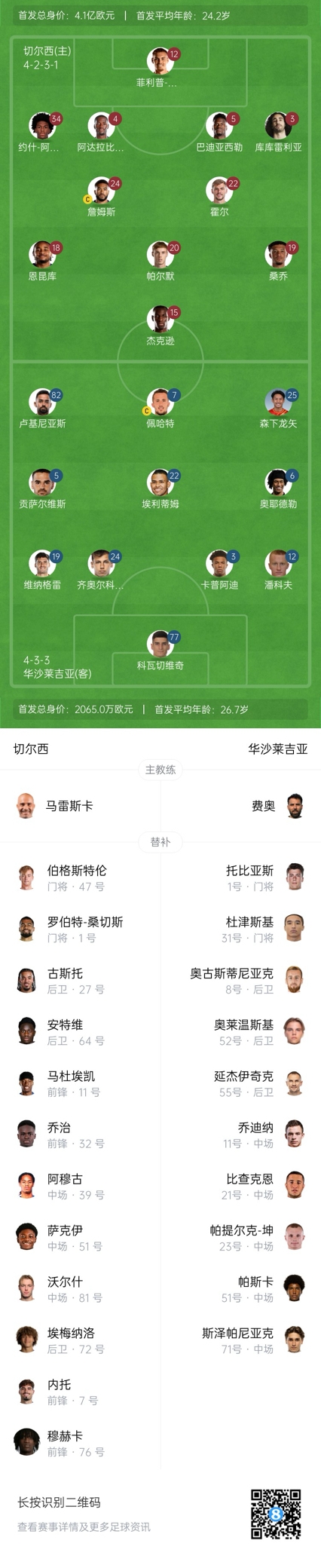 切尔西首发:12-约根森、4-阿达拉比奥尤、5-巴迪亚西勒、3-库库雷利亚、34-阿奇姆彭、22-迪尤斯伯里-霍尔、24-里斯-詹姆斯、20-帕尔默、18-恩昆库、19-桑乔、15-杰克逊