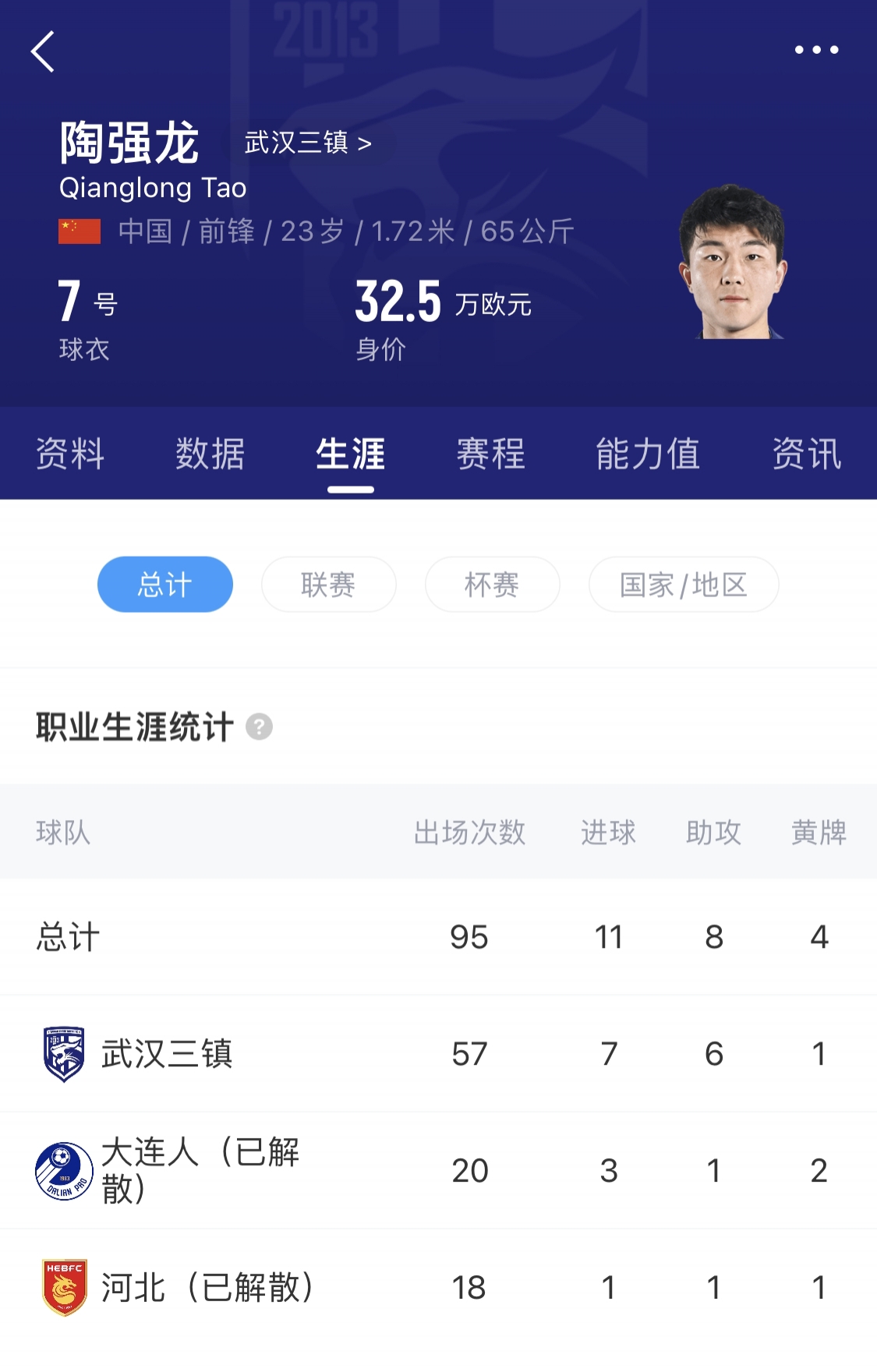 陶强龙于2001年11月20日出生在安徽,在场上司职前锋。