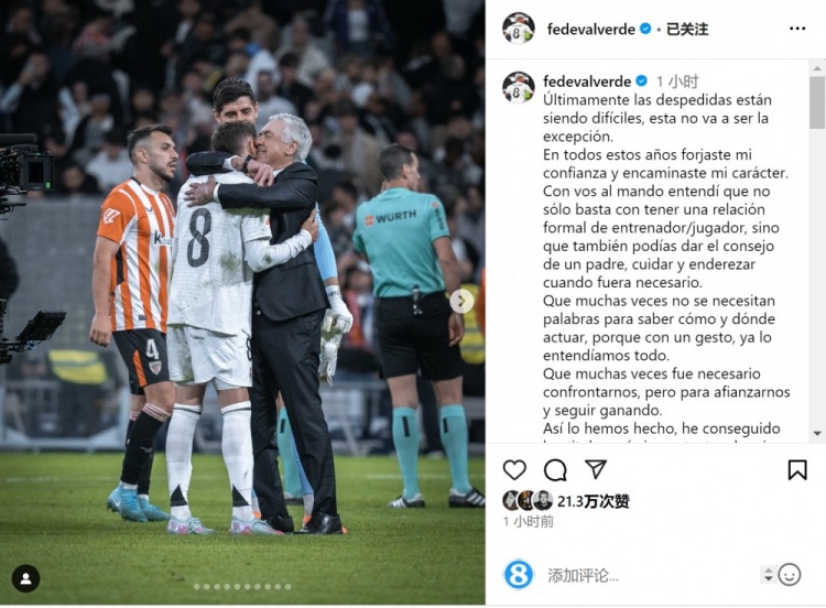 5月24日讯 皇马主帅安切洛蒂今夏离任,队内中场巴尔韦德社媒发文与之告别。