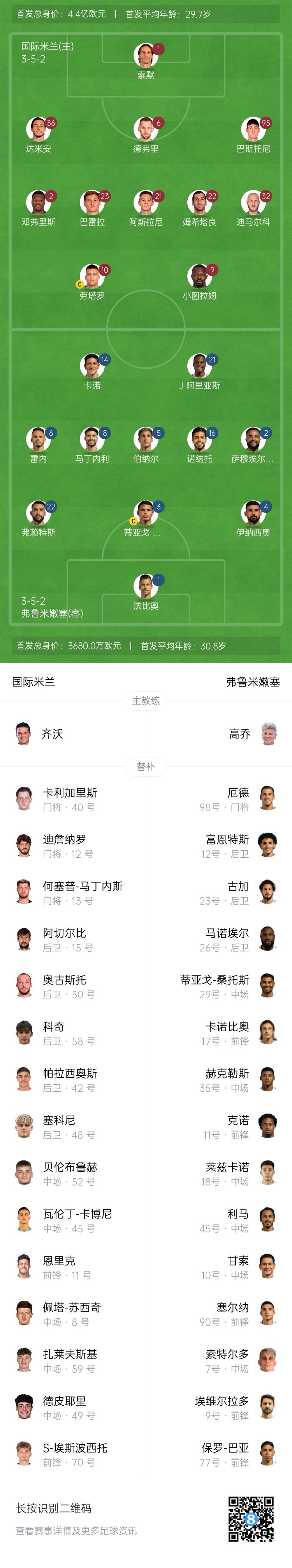 国米首发:1-索默、2-邓弗里斯、36-达米安、6-德弗里、95-巴斯托尼、32-迪马尔科、23-巴雷拉、21-阿斯拉尼、22-姆希塔良、9-图拉姆、10-劳塔罗