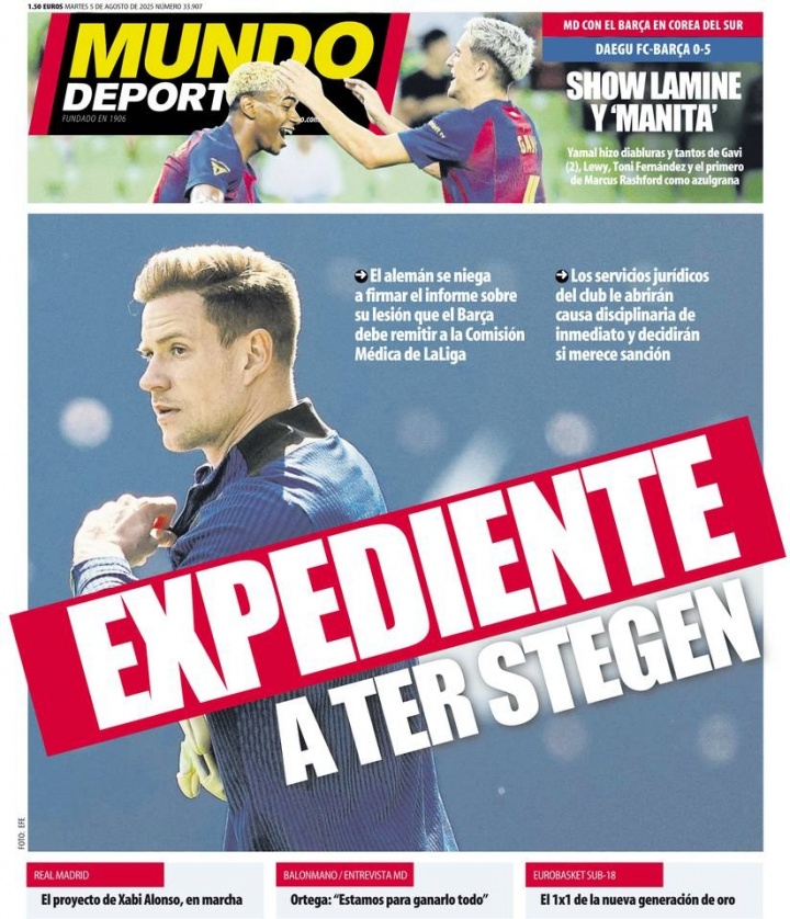 球员的医疗报告被视为私人信息,如果没有其本人的授权,巴萨无法将报告共享给西甲联赛部门。巴萨已经决定将此事件移交至法务部门,并立即启动纪律处分程序。如果俱乐部法务和董事会批准行动,他们将内部处罚特尔施特根。
