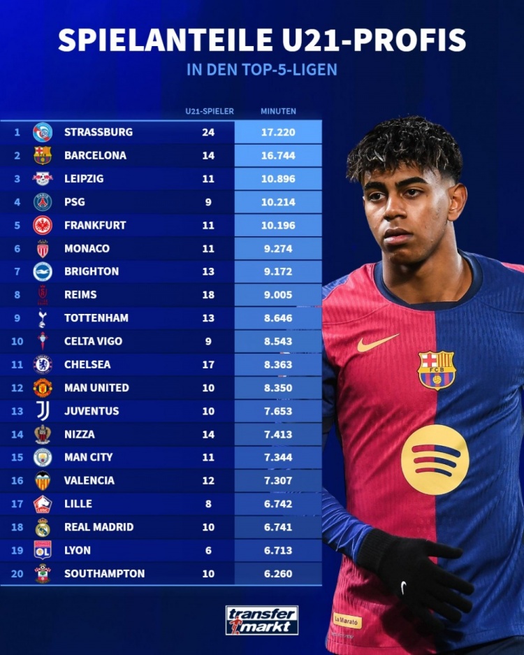 3月29日讯 德国转会市场统计了本赛季五大联赛球队U21球员的出场时间,并列出排名,斯特拉斯堡居首,巴萨、莱比锡排名二三位。本赛季五大联...