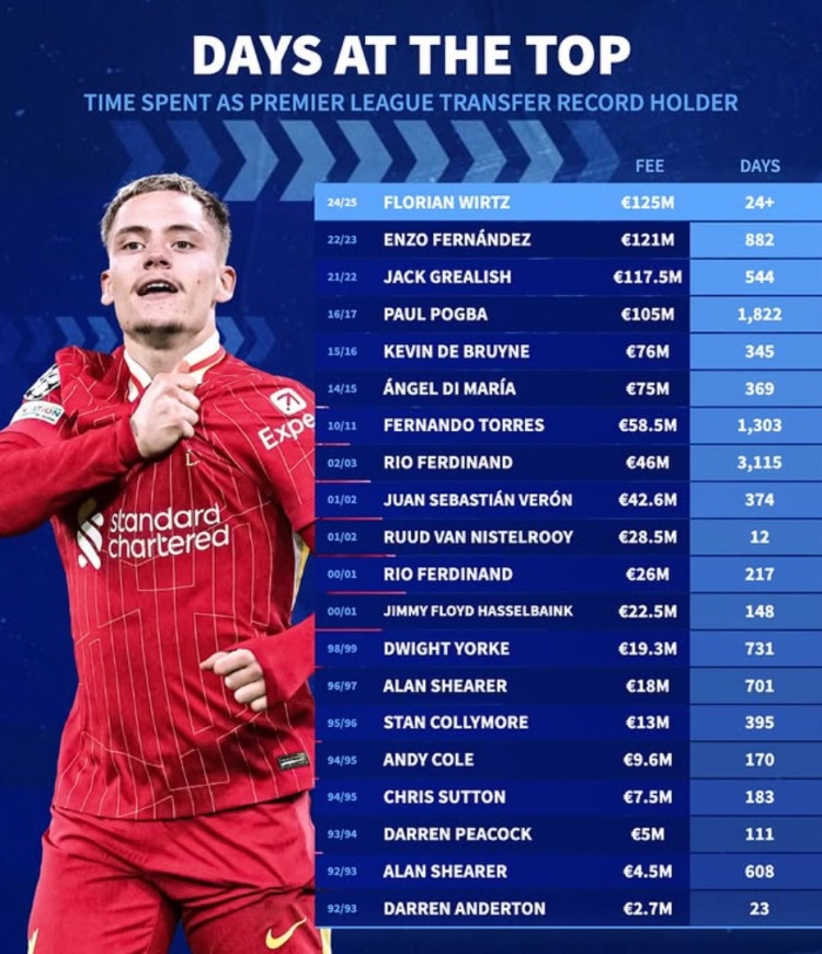 7月26日讯 《转会市场》统计了英超历任标王占据榜首的天数,新标王维尔茨刚24天。德转列英超历史标王“霸榜”天数:1.弗洛里安-维尔茨,1.2...